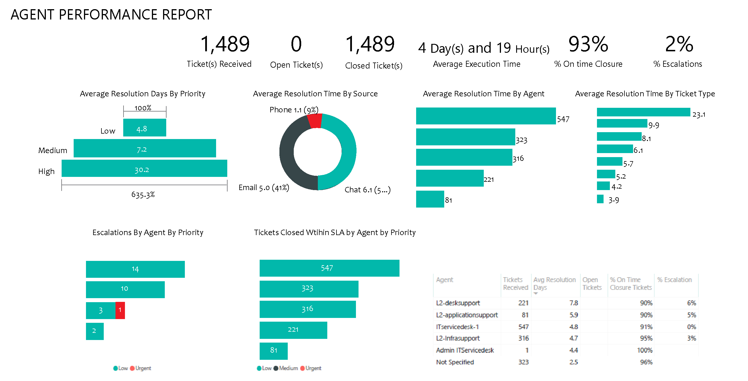 Agent Performance AnalysisThis dashboard presents the Agent Performance Details such as Average Resolution Time by Priority, Source and Ticket Type, Escalations and Tickets closed within SLA by Priority. The KPIs include Total tickets handled, Open tickets, Closed/Resolved tickets, Average resolution Time,% Tickets closed within SLA and %Escalations. The report can be filtered by Agent name and Ticket Created Date.