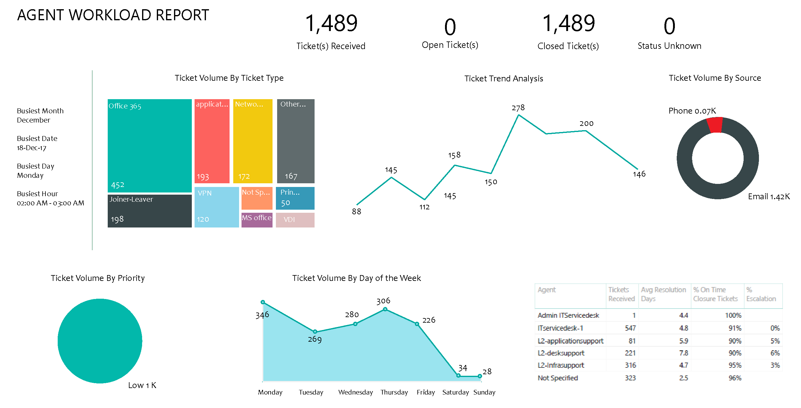 Agent Workload AnalysisThis dashboard presents the Agent Workload details by Ticket Type, Source, Ticket created date and Priority. The report can be filtered by Agent name and Ticket Created Date. The KPIs include Total tickets handled, Open tickets, Closed/Resolved tickets and Busiest Month, Day, Date and Hour.