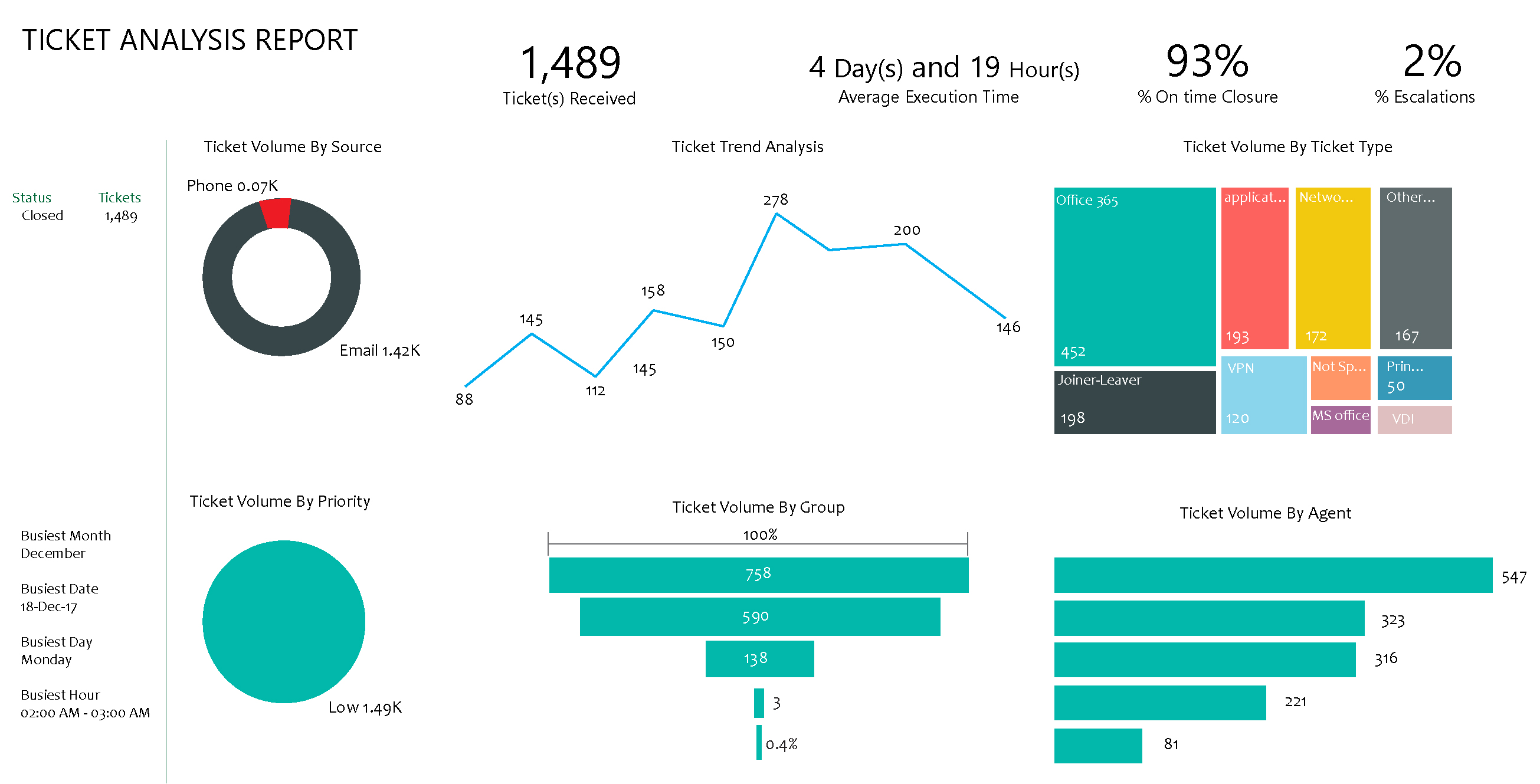Ticket Traffic AnalysisThis dashboard presents the Ticket Volume details by Ticket Status, Source, Ticket created date, Ticket type, Priority, Agent and Group. The report can be filtered by Ticket Created Date. The KPIs include Tickets received, Average Resolution Time, % Tickets closed within SLA , %Escalations and Busiest Month, Day, Date and Hour.