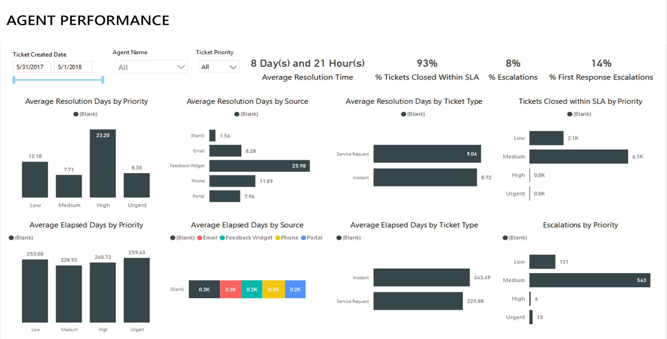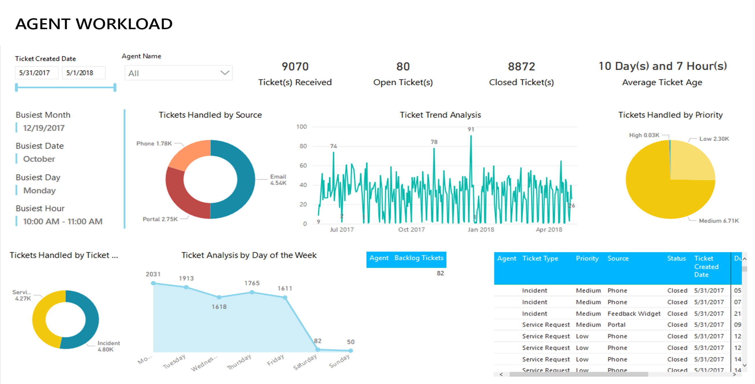 Agent Workload AnalysisThis dashboard provides complete analysis of the workload of an agent over a period of time. The Dashboard gives a view of source of the tickets, peak periods, priority levels among other parameters.