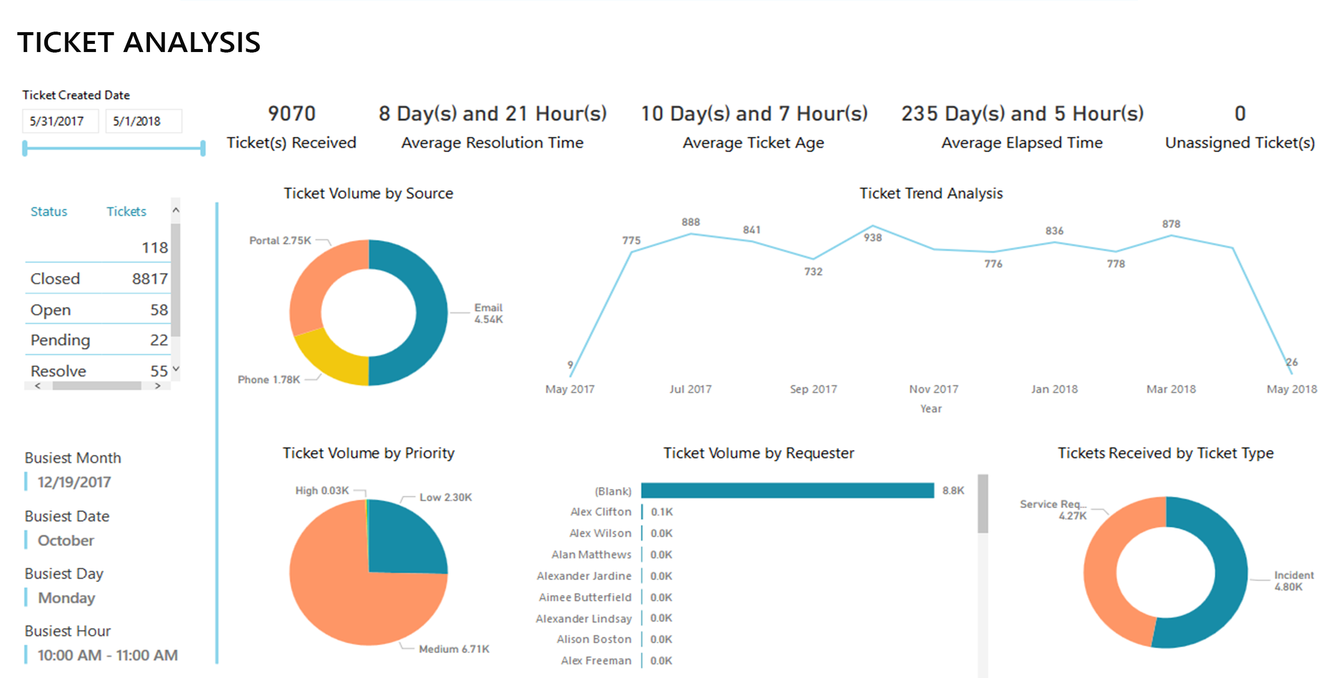 Ticket Traffic AnalysisThis dashboard provides an overview of the origin of tickets, priority, resolution time, requester along with trend analysis based on historical data.