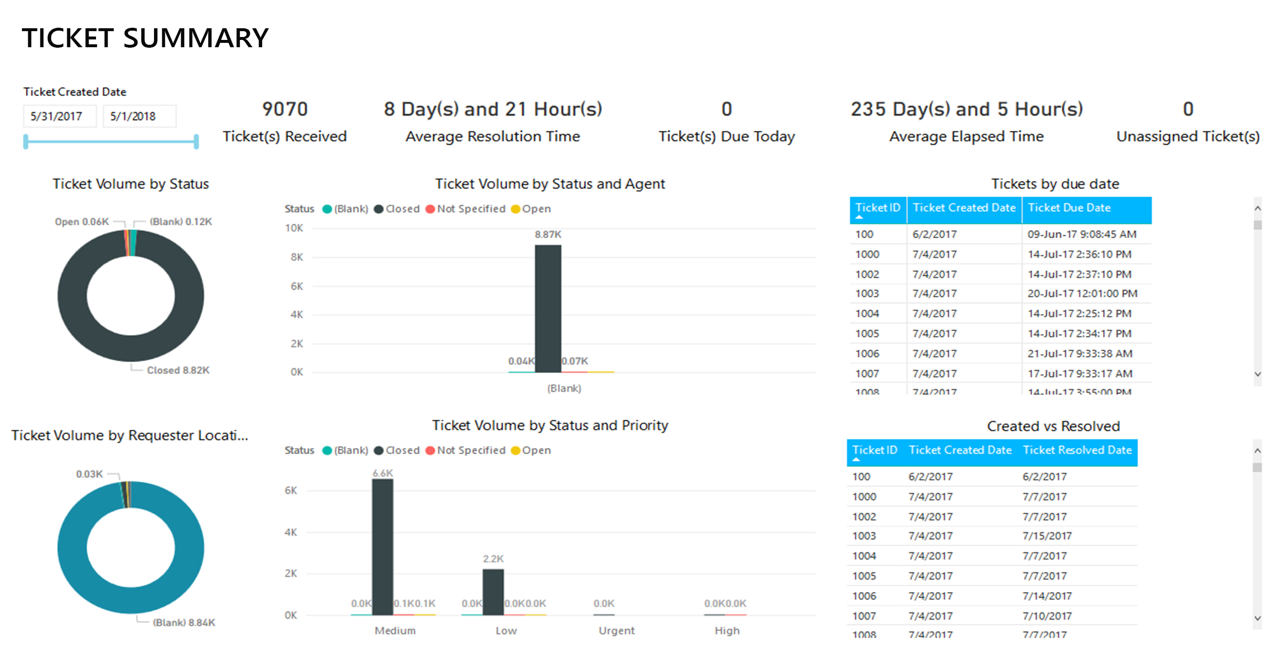 This dashboard provides an overview of the status of tickets, impact, status by agent and priority, requester location and department along with analysis based on created date vs due date and created date vs resolved date.